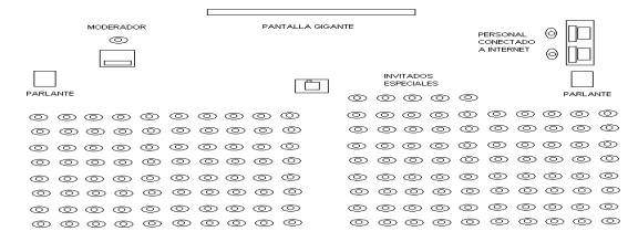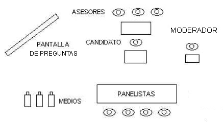 El candidato se sentará solo en la parte central y sus asesores en la parte de atrás, contara con una pantalla en donde podrá ver las preguntas, chats y otros medios electrónicos, así como el programa de selección de las mismas.