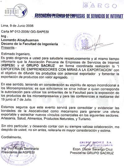 Es grato dirigirme a usted para hacerle llegar mis cordiales saludos y al mismo tiempo comunicarle que importantes empresas transnacionales están interesadas en implementar diversos servicio “On line ” a través de las Cabinas de Internet, debidamente capacitadas, de la Asociación Peruana de Empresas de Servicios de Internet (ASPESI).